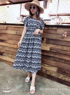连衣裙;雪纺;短袖;均码;中长款;套头;圆领;高腰;甜美;A字裙;纯色;印花