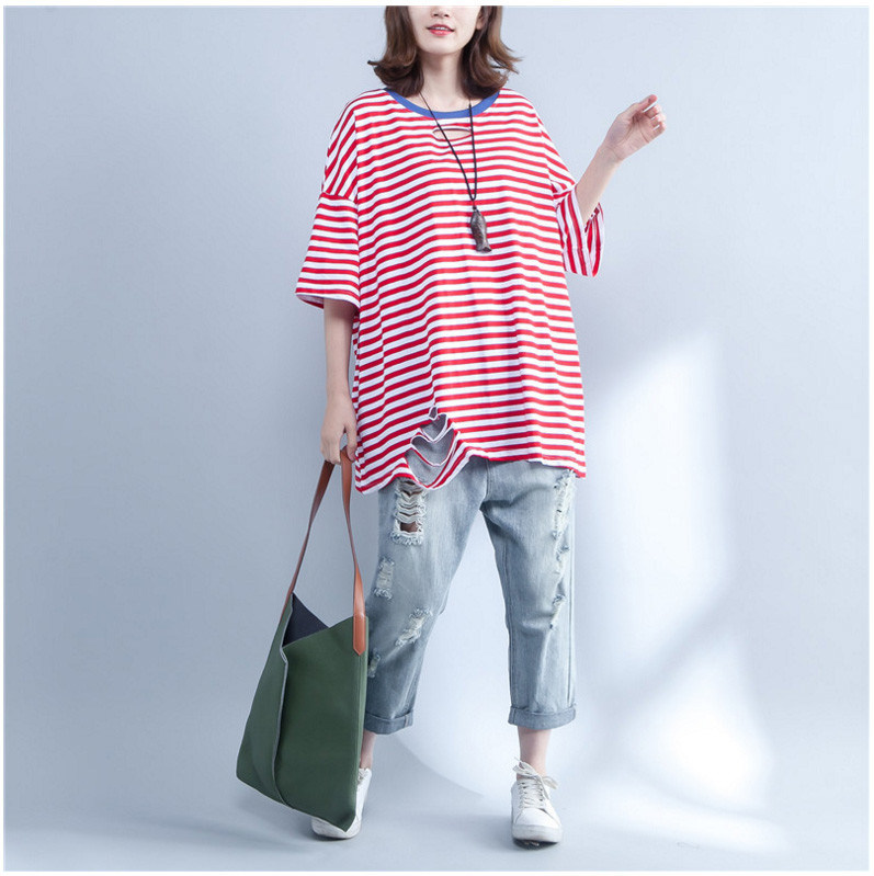 大码条纹T恤女2018夏季新品韩版休闲宽松胖MM短袖中长上衣